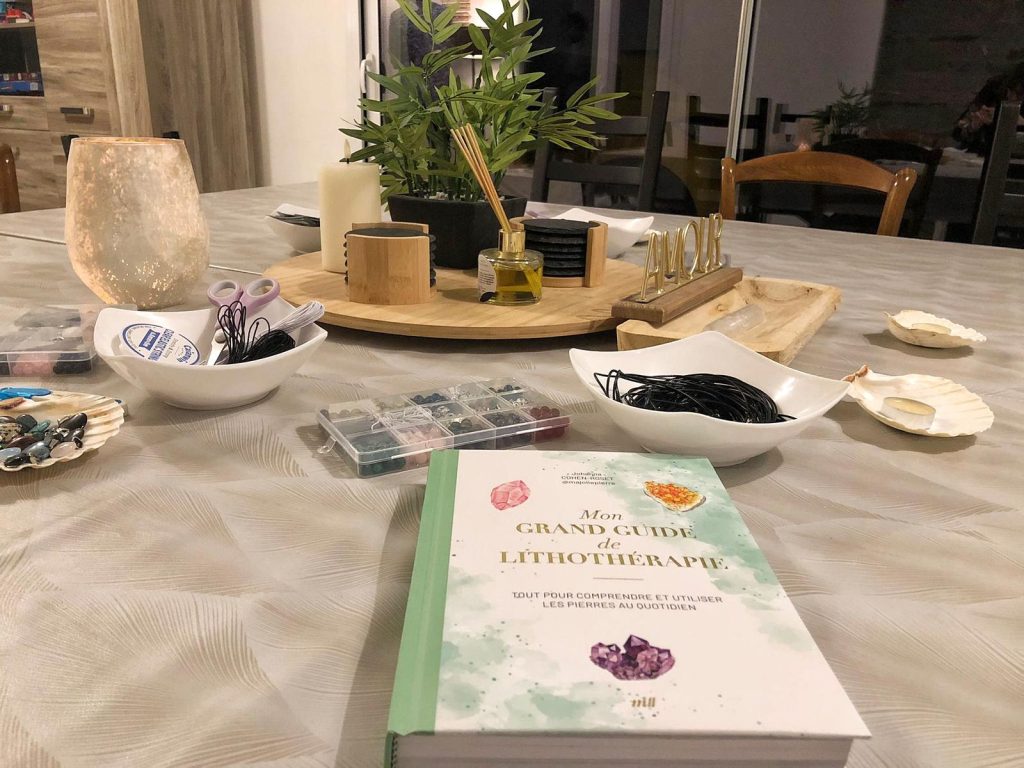 14 personnes réunies autour de cette table, pour profiter d’une méditation guidée par Christelle ! Nous avons ensuite découvert les bienfaits des pierres en créant un bijou, partager nos oracles….